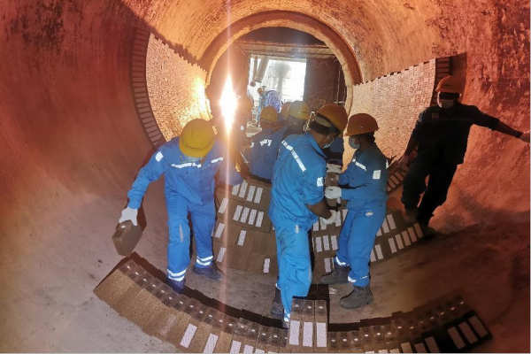 南加海螺印尼籍員工正在進(jìn)行1號(hào)窯耐火磚堆砌