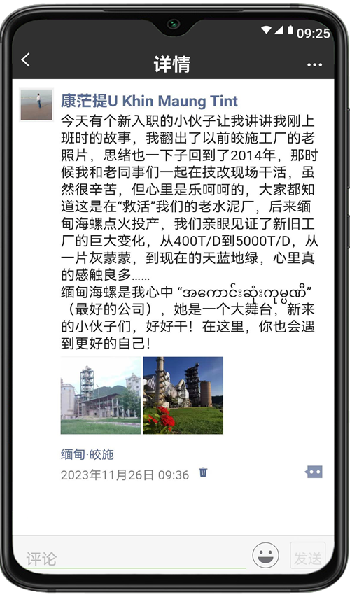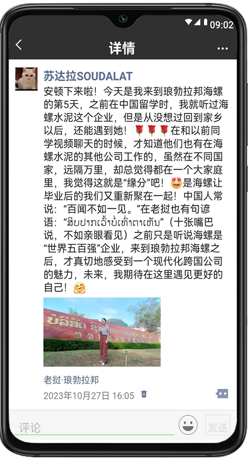 2023年是共建“一帶一路”倡議提出十周年,十年來(lái),海螺水泥堅(jiān)持人才“本地化”培養(yǎng),現(xiàn)在,海螺的大家庭里已有3000多名外籍員工,他們見(jiàn)證了一座座海螺工廠的拔地而起,還親身經(jīng)歷了海螺發(fā)展帶來(lái)的變化,在海螺收獲了成長(zhǎng)和友誼?,F(xiàn)在,就讓我們打開“朋友圈”,一起來(lái)看看他們的分享吧!