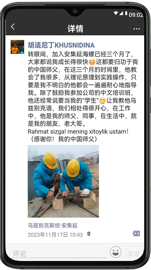 TUQMIRZAEV KHUSNIDINA(中文名:胡適尼?。?,2023年加入烏茲別克斯坦安集延海螺,現(xiàn)從事機(jī)械維修工作,照片為胡適尼丁和他的中國(guó)師父。