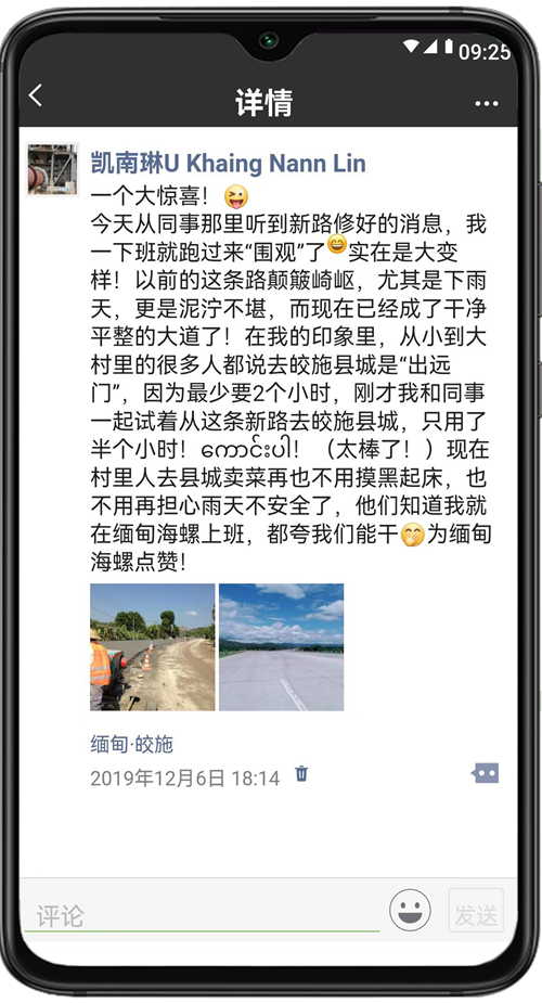 U Khaing Nann Lin(中文名:凱南琳),2017年進(jìn)入緬甸海螺,他居住的PyaukSeikPin村位于公司附近,一直以來(lái)只有泥濘的土路通往村外,村民出行極為不便。2019年,緬甸海螺對(duì)該條道路進(jìn)行鋪筑修繕,如今該道路已成為連接皎施縣城和PyaukSeikPin村的水泥大道,為村民的出行帶來(lái)了極大便利。