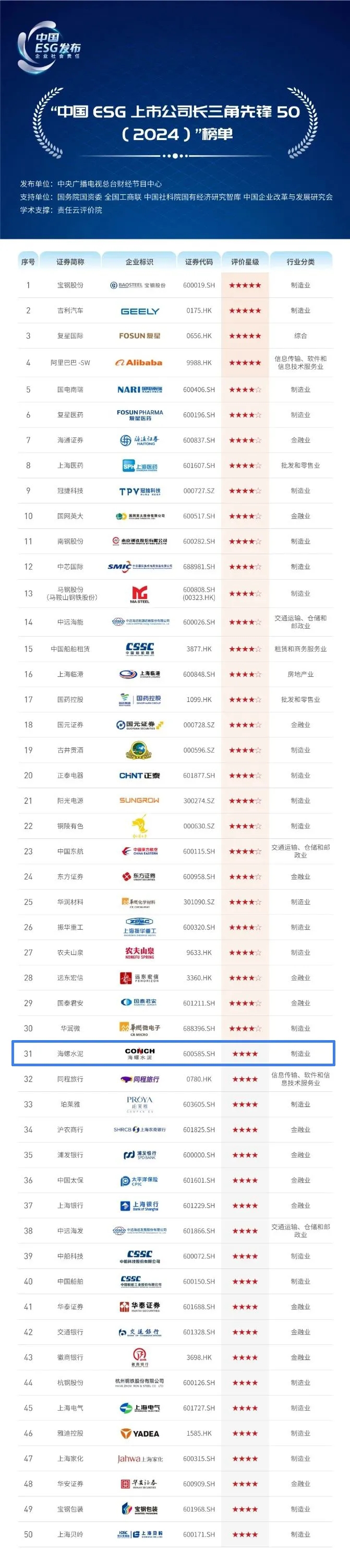 8月7日,中央廣播電視總臺(tái)《長(zhǎng)三角ESG行動(dòng)報(bào)告》正式對(duì)外發(fā)布。海螺水泥憑借優(yōu)異的ESG表現(xiàn),入選“中國(guó)ESG上市公司長(zhǎng)三角先鋒50(2024)”榜單,名列第31位。