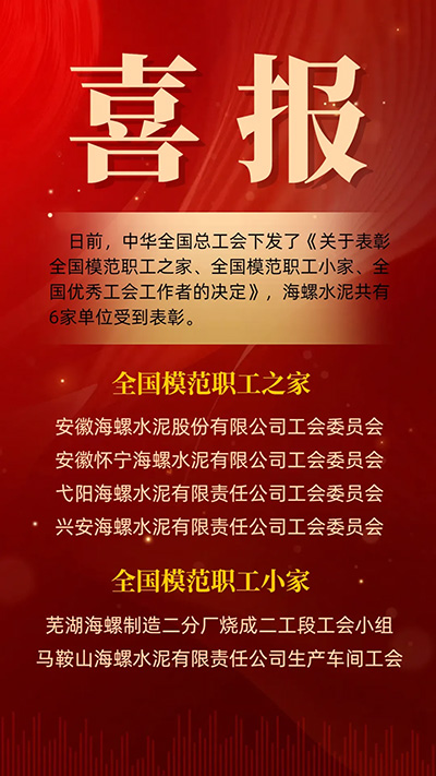 日前,中華全國總工會下發(fā)了《關(guān)于表彰全國模范職工之家、全國模范職工小家、全國優(yōu)秀工會工作者的決定》,海螺水泥共有6家單位獲得表彰。其中,安徽海螺水泥股份有限公司工會委員會、安徽懷寧海螺水泥有限公司工會委員會、弋陽海螺水泥有限責(zé)任公司工會委員會、興安海螺水泥有限責(zé)任公司工會委員會獲評“全國模范職工之家”,蕪湖海螺水泥有限公司制造二分廠燒成二工段工會小組、馬鞍山海螺水泥有限責(zé)任公司生產(chǎn)車間工會獲評“全國模范職工小家”。