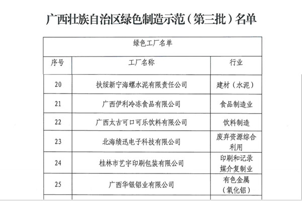 近日,廣西自治區(qū)工業(yè)信息化廳發(fā)布廣西第三批綠色工廠名單,扶綏新寧海螺水泥有限責(zé)任公司榜上有名,榮獲“自治區(qū)級(jí)綠色工廠”榮譽(yù)稱號(hào)。