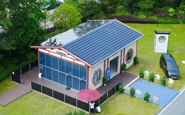 “海螺屋”采用海螺節(jié)能環(huán)保低碳新材料搭建而成,室內(nèi)門(mén)窗、地板、家具全部采用海螺新材全屋定制生態(tài)家居,兩側(cè)外墻及屋頂鋪設(shè)宣城海螺建筑光伏幕墻與光伏瓦,與建筑完美融為一體?!昂B菸荨痹O(shè)計(jì)融合了中國(guó)與東南亞建筑元素,以及海螺生態(tài)環(huán)保、建筑節(jié)能的理念,整體呈現(xiàn)新中式風(fēng)格,集中展現(xiàn)了海螺集團(tuán)RCEP區(qū)域經(jīng)貿(mào)合作新成就,展示了海螺新能源、新材料和數(shù)智發(fā)展新成果、新產(chǎn)品,詮釋了海螺為人類(lèi)創(chuàng)造未來(lái)生活空間的不懈追求。