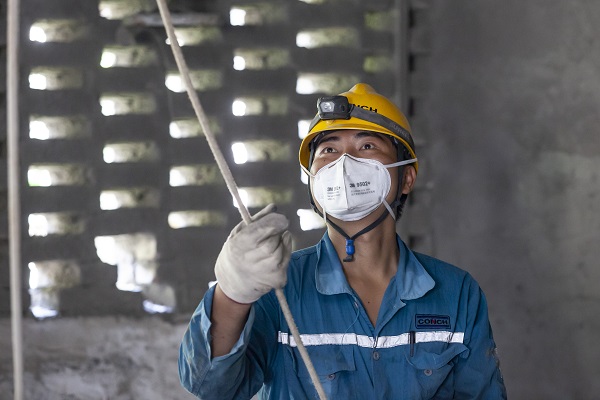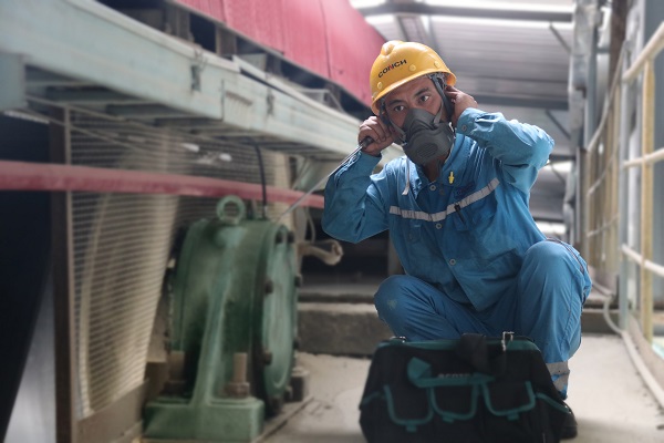 正在前往一線喂料樓的章利,勞保服已被汗水所浸透,干濕分明,手套、安全帽、勞保服在保障員工安全的同時(shí),也見(jiàn)證著海螺人默默的付出。(龍新陽(yáng)/攝)