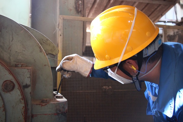 蕪湖海螺1號(hào)窯1218皮帶減速機(jī)前,巡檢工章利正在對(duì)減速機(jī)油位進(jìn)行檢查,他說(shuō):“巡檢是直接接觸設(shè)備的工作,要確保安全穩(wěn)定,不能出一絲紕漏?!保埿玛?yáng)/攝)