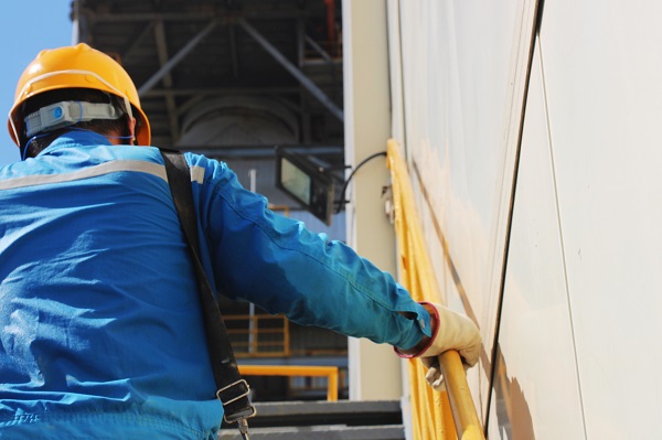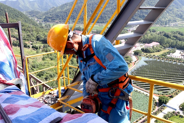 送修完成的電機(jī)送達(dá)預(yù)熱器頂,維修班長(zhǎng)張如山正在進(jìn)行最終吊裝,高處不勝“暑”,卻難擋海螺人火熱的干勁。(王浩然/攝)