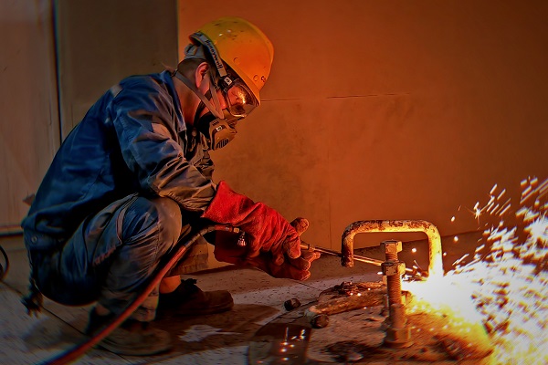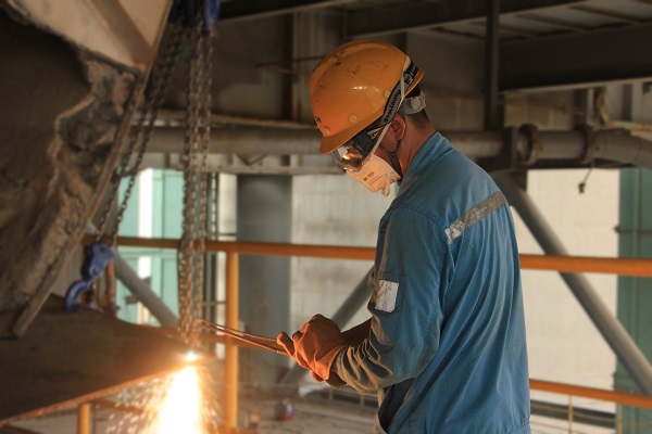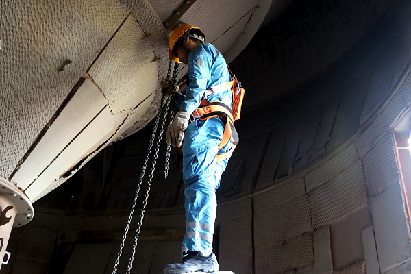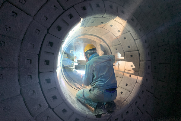 窯檢修現(xiàn)場(chǎng),機(jī)械維修工張紅勝全神貫注地操作著氣割槍,即便得心應(yīng)手,他也始終保持謹(jǐn)慎與專注。(王凱/攝)