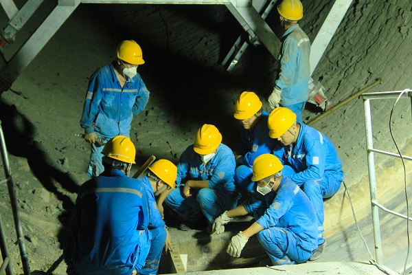 制造二分廠廠長(zhǎng)鄭新軍正在4號(hào)窯胴體內(nèi)與施工負(fù)責(zé)人研討耐火磚砌筑方案,你一言、我一語(yǔ),火熱的環(huán)境見(jiàn)證著海螺人火熱的激情。(王凱/攝)