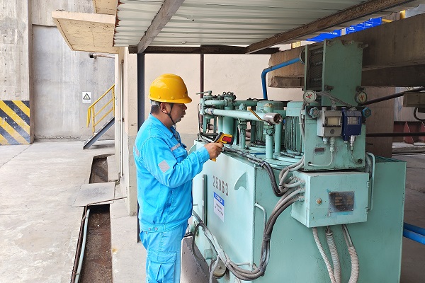 在高溫風(fēng)機(jī)油站前,制造分廠副廠長(zhǎng)羅紅波緊盯著儀器讀數(shù),對(duì)設(shè)備運(yùn)行情況進(jìn)行逐一點(diǎn)檢。“設(shè)備‘中暑生病’,也同樣十分危險(xiǎn),點(diǎn)檢工作可馬虎不得。”羅紅波說(shuō)。(朱貴宏/攝)