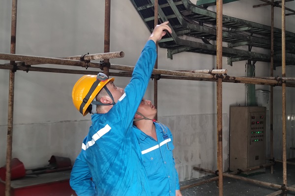 制造分廠廠長(zhǎng)易軍和工段長(zhǎng)周飛來(lái)到二線煤磨房現(xiàn)場(chǎng)查看設(shè)備狀況,他們的勞保服已經(jīng)被汗水浸透。(張洪俊/攝)