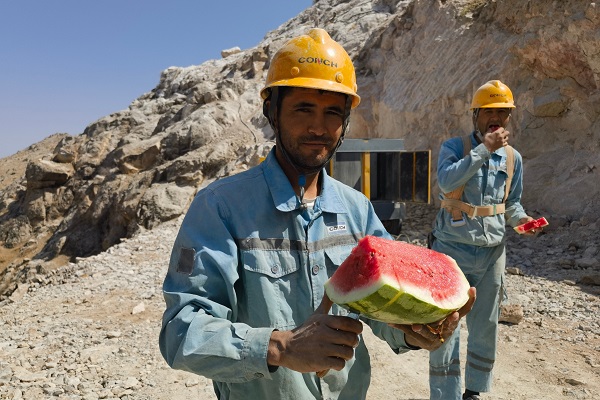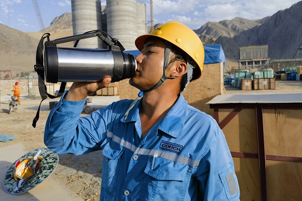 時(shí)值高溫時(shí)節(jié),中亞腹地干燥炎熱,安集延海螺的工程建設(shè)正如火如荼地進(jìn)行,一座現(xiàn)代化的水泥工廠正在拔地而起。圖為設(shè)備保全處李開(kāi)留在完成總降設(shè)備安裝后,正在喝水休憩。(繆明東/攝)