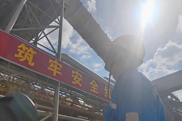 三線預(yù)熱器密尾煙室不斷往外噴涌著滾滾熱浪,身著高溫防護(hù)服的巡檢員譚平,正在對(duì)煙室內(nèi)的結(jié)皮進(jìn)行清理,保障回轉(zhuǎn)窯穩(wěn)定運(yùn)行。(秦建明/攝)
