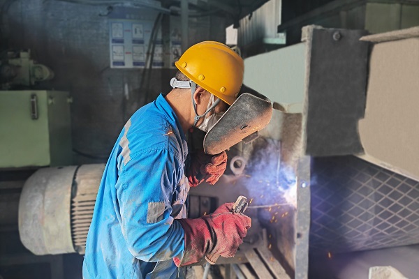 坐標(biāo)烏茲別克斯坦,卡爾希海螺的技改工作正在有序進(jìn)行中,這是水泥磨磨頭密封改造現(xiàn)場(chǎng),烏籍員工加發(fā)在焊接作業(yè)中的背影。(孫艷偉/攝)
