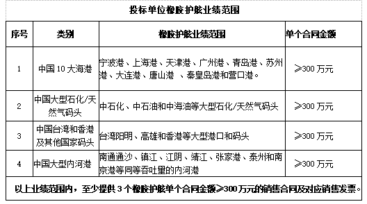 2、投標(biāo)單位需具有國內(nèi)10大港口(含下轄港口),或大型石化和天然氣碼頭,或香港和臺(tái)灣大型港口,或中國主要內(nèi)河港口的橡膠護(hù)舷銷售業(yè)績(jī),至少提供3個(gè)以上單筆直銷合同額超過300萬元業(yè)績(jī)(其他港口、碼頭的橡膠護(hù)舷業(yè)績(jī)或非橡膠護(hù)舷產(chǎn)品業(yè)績(jī),或單個(gè)訂單低于300萬元橡膠護(hù)舷業(yè)績(jī)不計(jì)算在內(nèi)),詳見附件1。