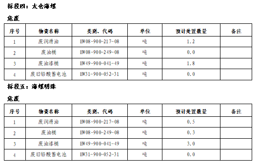 標段、標的物名稱、數(shù)量等信息詳見下表,具體數(shù)量以實際過磅處置數(shù)量為準。