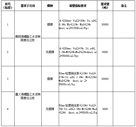 海螺水泥貴州區(qū)域擬對2021年8月21日至2021年9月20日生產(chǎn)用煤炭進行公開招標(biāo),選定中標(biāo)單位,現(xiàn)將相關(guān)招標(biāo)事宜公示如下: