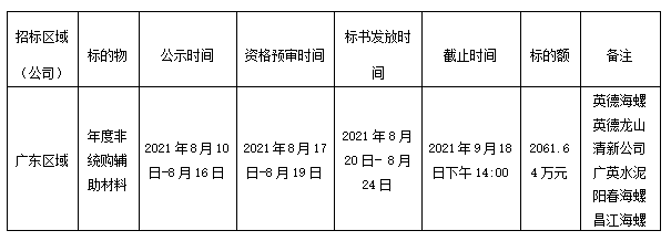 廣東區(qū)域2021-2022年度非統(tǒng)購輔材合同即將到期,為做好區(qū)域各子公司生產(chǎn)用輔助材料的供應(yīng)工作,本著“公開、公平、公正、透明”的原則,由陽春海螺牽頭,組織開展英德海螺、英德龍山、清新公司、廣英水泥、陽春海螺、昌江海螺非統(tǒng)購輔材聯(lián)合招標(biāo)工作,此次招標(biāo)擬采取公開招標(biāo)的方式,招標(biāo)基本信息發(fā)布如下: