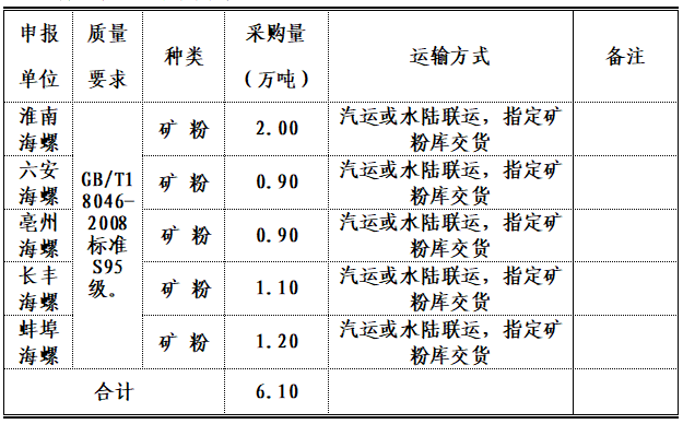 2.交貨地點(diǎn):淮南海螺、六安海螺、亳州海螺、長豐海螺、蚌埠海螺五家公司指定礦粉庫。
