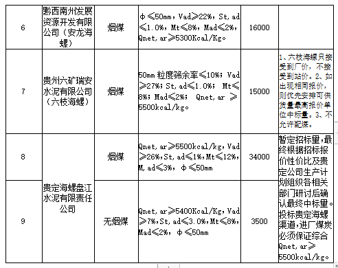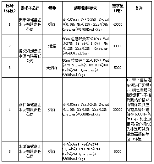 海螺水泥貴州區(qū)域擬對2021年10月21日至2021年11月20日生產(chǎn)用煤炭進(jìn)行公開招標(biāo),選定中標(biāo)單位,現(xiàn)將相關(guān)招標(biāo)事宜公示如下: