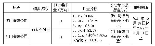 安徽海螺水泥股份有限公司廣東區(qū)域下屬的佛山、江門、海螺兩家家公司擬聯(lián)合開展石灰石粉末公開招標工作,為進一步體現公平、公正、公開的原則,拓寬采購渠道,提高采購質量,現將相關事宜公告如下: