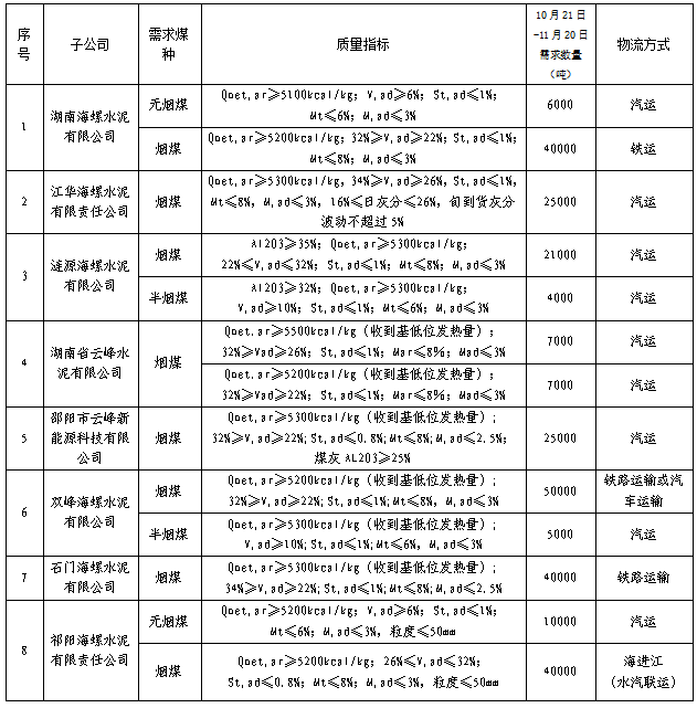 根據(jù)2021年10月21日-2021年11月20日海螺水泥湖南區(qū)域各子公司煤炭需求,現(xiàn)擬對煤炭進行公開招標(biāo),選定中標(biāo)人,為體現(xiàn)公平、公正、公開的原則,拓寬采購渠道,現(xiàn)將招標(biāo)相關(guān)事宜公告如下: