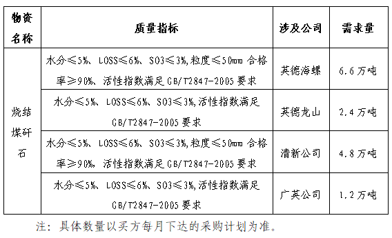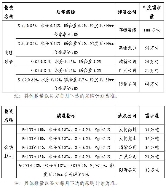 根據(jù)生產(chǎn)用料需求,擬對英德海螺、龍山、清新、廣英、陽春公司2021-2022年度高硅砂巖、含鐵粘土、燒結(jié)煤矸石進行招標,為進一步體現(xiàn)公平、公正、公開的原則,現(xiàn)將招標采購信息發(fā)布如下: