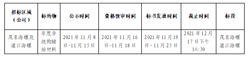茂名海螺及湛江海螺2022年度非統(tǒng)購(gòu)輔材合同即將到期,為做好兩公司生產(chǎn)用輔助材料的供應(yīng)工作,本著“公開(kāi)、公平、公正、透明”的原則,由茂名海螺牽頭,組織湛江海螺開(kāi)展2022年度非統(tǒng)購(gòu)輔材聯(lián)合招標(biāo)工作,此次招標(biāo)擬采取公開(kāi)招標(biāo)的方式,招標(biāo)基本信息發(fā)布如下: