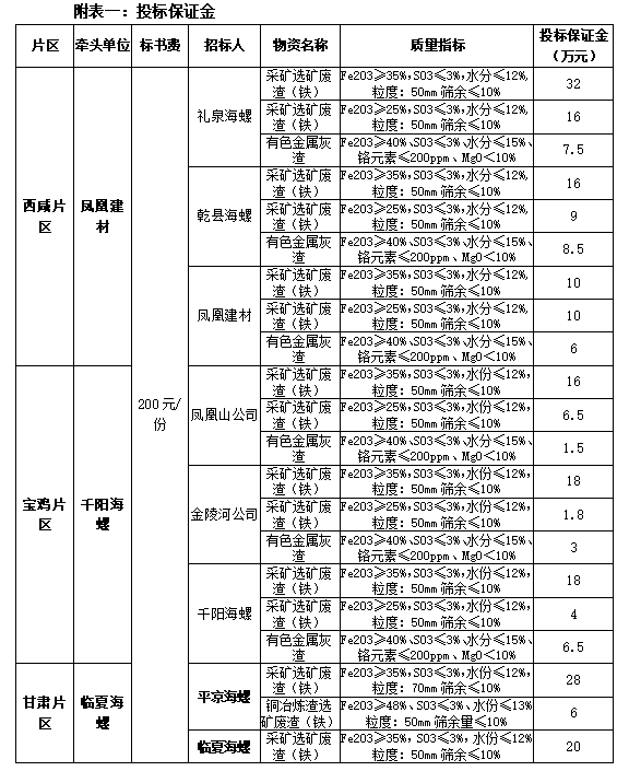 根據(jù)2022年度禮泉海螺、平?jīng)龊B荨⑶ш柡B?、乾縣海螺、臨夏海螺、鳳凰建材、金陵河公司、鳳凰山公司等8家公司生產(chǎn)經(jīng)營計劃,現(xiàn)對2022年度鐵質(zhì)材料(直供)采購組織招標(biāo),為進一步體現(xiàn)公平、公正、公開透明的原則,此次招標(biāo)將在安徽海螺水泥股份有限公司陽光采購平臺公開進行,現(xiàn)將招標(biāo)采購信息發(fā)布如下: