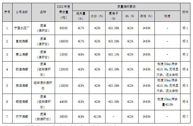 根據(jù)2022年度安徽海螺水泥股份有限公司寧國水泥廠(以下簡稱:寧國水泥廠)、安徽宣城海螺水泥有限公司(以下簡稱:宣城海螺)、黃山海螺水泥有限責(zé)任公司(以下簡稱;黃山海螺)、安徽銅陵海螺水泥有限公司(以下簡稱:銅陵海螺)、安徽荻港海螺水泥股份有限公司(以下簡稱:荻港海螺)、蕪湖海螺水泥有限公司(以下簡稱:蕪湖海螺)、安徽懷寧海螺水泥有限公司(以下簡稱:懷寧海螺)生產(chǎn)需求,對(duì)水泥生產(chǎn)配料用煤矸石采購進(jìn)行聯(lián)合公開招標(biāo),為體現(xiàn)公平、公正、公開的原則,同時(shí)為拓寬采購渠道,提高采購質(zhì)量,現(xiàn)將招標(biāo)相關(guān)事宜公告如下: