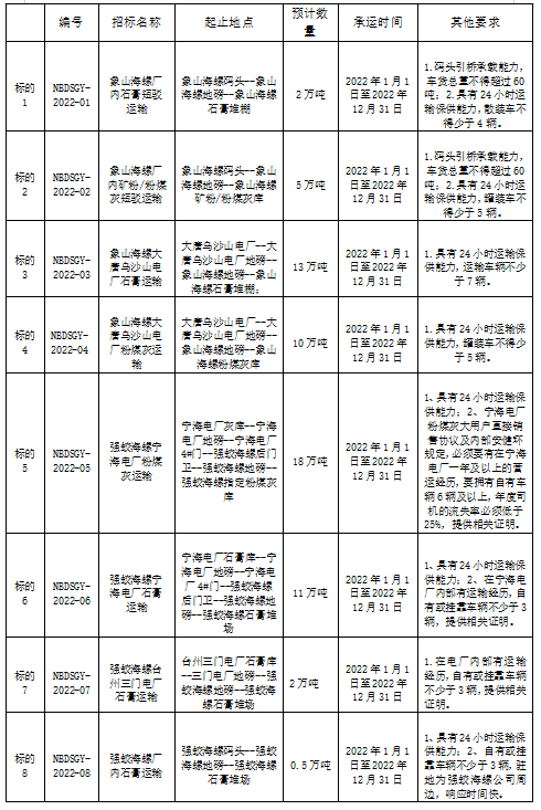 2、本次招標活動要求投標單位具有24小時運輸保供能力,在以往運輸過程中無不良記錄。投標運輸單位必須列出用于標的原材料品種運輸?shù)能囕v明細及載重噸位,且投標單位列出的運輸車輛不得與其他投標單位重復,招標人有權要求投標單位對其填報的運輸工具事實予以進一步澄清,否則取消其投標資格。