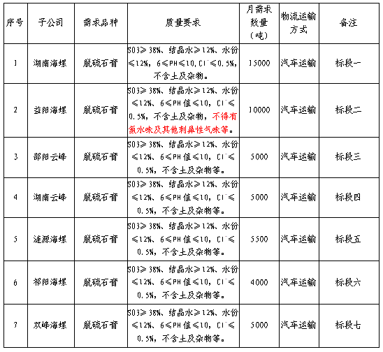 招標(biāo)人:海螺水泥湖南區(qū)域脫硫石膏招標(biāo)組
