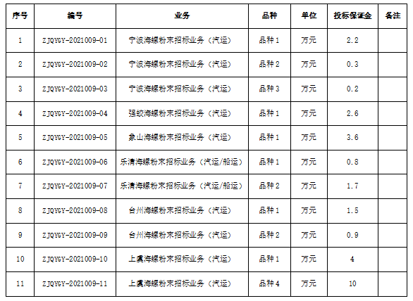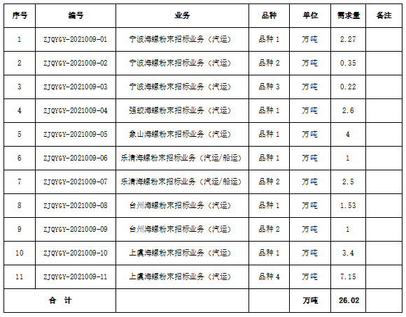 為進(jìn)一步體現(xiàn)公平、公正、公開的原則,拓寬采購渠道,提高采購質(zhì)量,增強(qiáng)粉末保供安全性。浙江區(qū)域?qū)幉êB?、象山海螺、?qiáng)蛟海螺、臺(tái)州海螺、上虞海螺、樂清海螺六家公司聯(lián)合對(duì)2022年一季度水泥生產(chǎn)所需的粉末采購進(jìn)行公開招標(biāo),現(xiàn)將相關(guān)事宜公告如下: