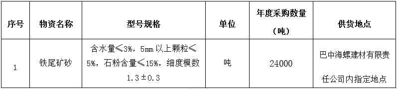 為進一步提升鐵尾礦砂采購招標的公平、公正、公開透明性,根據(jù)巴中海螺建材(商混)生產需求情況,現(xiàn)組織開展鐵尾礦砂公開招標,特將招標事宜公告如下: