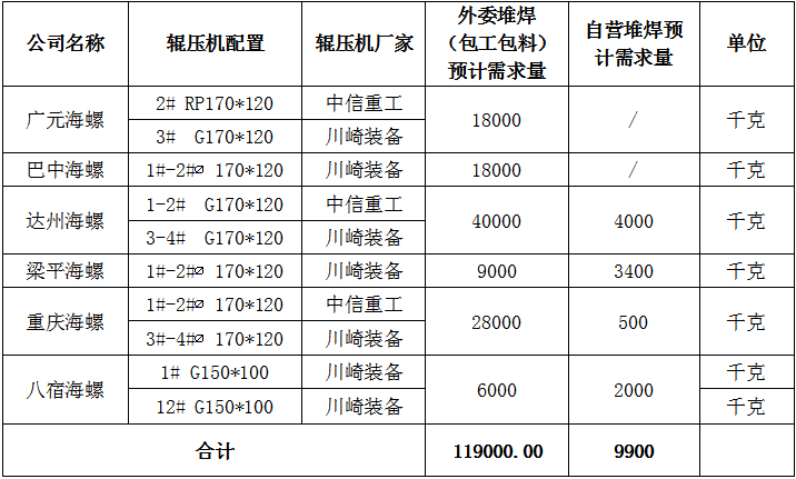 根據(jù)2022-2023年度水泥磨輥壓機(jī)輥面堆焊及日?;y層修補(bǔ)需求,海螺水泥川渝區(qū)域各子公司擬對(duì)輥壓機(jī)維修用耐磨焊絲進(jìn)行招標(biāo),為進(jìn)一步體現(xiàn)公開、公平、公正、擇優(yōu)的原則,拓寬采購(gòu)渠道,保證采購(gòu)質(zhì)量,現(xiàn)將招標(biāo)相關(guān)信息公告如下: