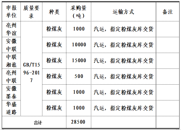 亳州華誼、安徽中聯(lián)、中聯(lián)湘譙、亳州中聯(lián)、安徽墨泰和華盛道路粉煤灰合同將于2021年12月31日到期。為保證合同到期后粉煤灰供貨的有序銜接,根據(jù)《物資采購(gòu)招標(biāo)管理辦法》和《物資采購(gòu)招標(biāo)實(shí)施細(xì)則》相關(guān)制度要求,擬采取公開招標(biāo)方式實(shí)施,選定中標(biāo)人?,F(xiàn)將相關(guān)事宜公告如下: