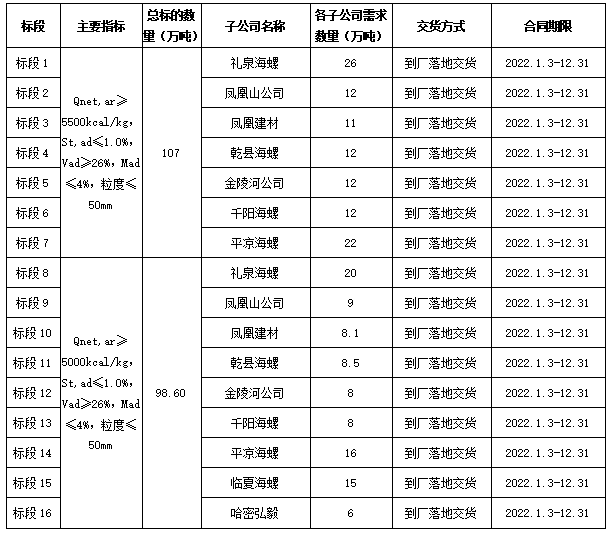 根據(jù)2022年陜甘區(qū)域各子公司煤炭需求,為保障各公司生產(chǎn),擬對2022年煤炭采購進行公開招標,為體現(xiàn)公平、公正、公開的原則,此次招標將在安徽海螺水泥股份有限公司陽光采購平臺公開進行,現(xiàn)將招標相關(guān)事宜公告如下:
