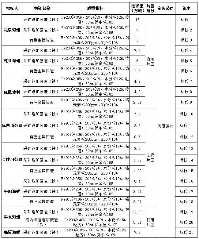 根據(jù)2022年度禮泉海螺、平?jīng)龊B?、千陽海螺、乾縣海螺、臨夏海螺、鳳凰建材、金陵河公司、鳳凰山公司等8家公司生產(chǎn)經(jīng)營計劃,現(xiàn)對2022年度鐵質(zhì)材料(直供)采購組織招標,為進一步體現(xiàn)公平、公正、公開透明的原則,此次招標將在安徽海螺水泥股份有限公司陽光采購平臺公開進行,現(xiàn)將招標采購信息發(fā)布如下: