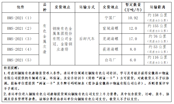 4.2 本次招標活動要求投標單位具有運輸保供經驗(要求提供相關證明)和強大的保供能力(在遵守2011年7月1日、2011年8月1日和2014年6月1日及2016年9月21日頒布的《公路安全保護條例》、《公路超限檢測站管理辦法》及《安徽省治理貨物運輸車輛超限超載條例、《超限運輸車輛行駛公路管理規(guī)定》等法律、法規(guī)的前提下,24小時有色金屬灰渣運輸能力須達到2000噸,招標人根據國家核載車型載重噸位標準審查投標人承運車數是否能夠滿足運力要求,必須具有足夠的運輸車輛合法運載,且承運車輛必須為后卸式,滿足招標單位24小時運輸要求,不能影響招標單位正常的生產經營活動。