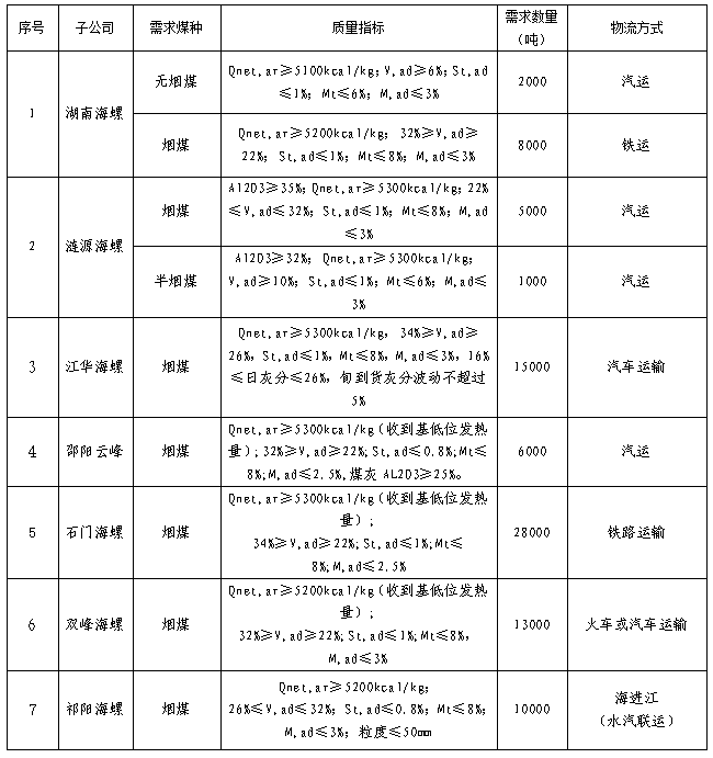 根據2022年1月21日-2022年2月20日海螺水泥湖南區(qū)域各子公司煤炭需求,現(xiàn)擬對煤炭進行公開招標,選定中標人,為體現(xiàn)公平、公正、公開的原則,拓寬采購渠道,現(xiàn)將招標相關事宜公告如下: