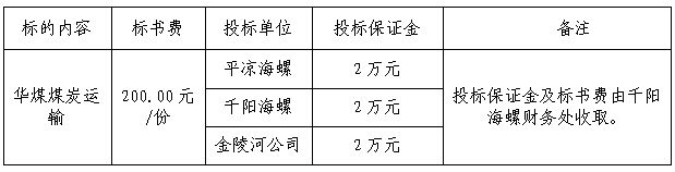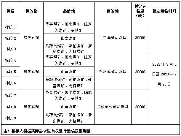現(xiàn)對平?jīng)龊B?、千陽海螺和金陵河公?022年華亭煤炭運輸組織公開招標,為進一步體現(xiàn)公平、公正、公開透明的原則,現(xiàn)將招標信息發(fā)布如下: