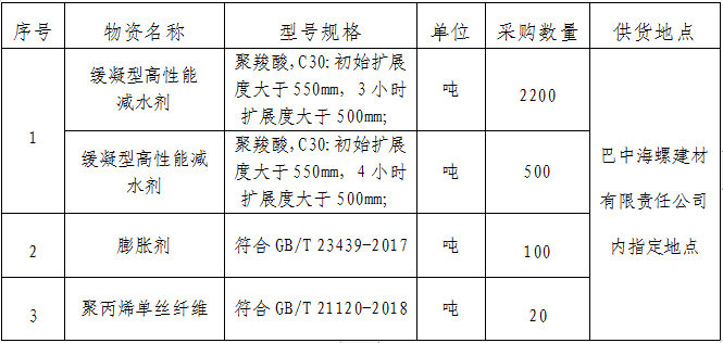 鑒于2022年生產(chǎn)方量大幅提升,為進一步提升外加劑采購招標(biāo)的公平、公正、公開透明性,根據(jù)巴中海螺建材(商混)外加劑需求,現(xiàn)組織開展外加劑公開招標(biāo),特將招標(biāo)事宜公告如下: