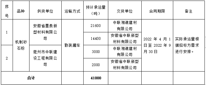 為做好2022年4-9月份安徽墨泰和亳州中聯(lián)機(jī)制砂石粉至安徽中聯(lián)、中聯(lián)湘譙短倒運(yùn)輸招標(biāo)工作,由安徽海螺綠色新材料有限公司采購部牽頭,對(duì)上述線路運(yùn)輸進(jìn)行公開招標(biāo),特將本次招投標(biāo)的有關(guān)事宜公告如下: