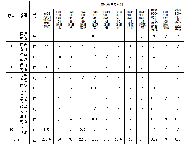 為做好廣東區(qū)域英德海螺水泥有限責任公司(以下簡稱英德海螺)、廣東清新水泥有限公司(以下簡稱清新海螺)、江門海螺水泥有限公司(以下簡稱江門海螺)、湛江海螺水泥有限責任公司(以下簡稱湛江海螺)、佛山海螺水泥有限責任公司(以下簡稱佛山海螺)、茂名市大地水泥有限公司(以下簡稱茂名大地)、陽春海螺水泥有限責任公司(以下簡稱陽春海螺)、廣東清遠廣英水泥有限公司(以下簡稱廣英水泥)、廣東海螺鴻豐水泥有限公司(以下簡稱鴻豐水泥)以及英德龍山水泥有限責任公司(以下簡稱英德龍山)2022-2023年危廢處置工作,防范環(huán)?;轱L險,本次由江門海螺牽頭對以上10家公司危廢物資處置進行公開招標,歡迎具備條件的單位參加。現(xiàn)將招標基本信息發(fā)布如下: