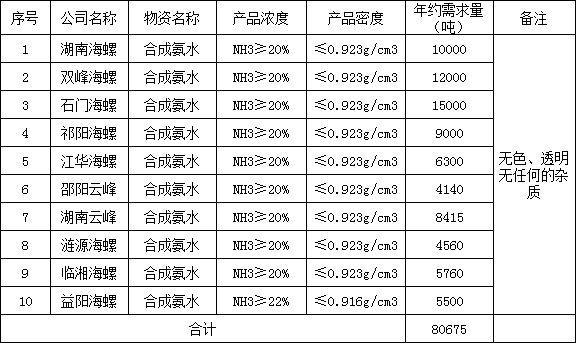 為做好海螺水泥湖南區(qū)域2022~2023年度氨水采購工作,現(xiàn)擬對氨水采購實行統(tǒng)一公開招標。湖南區(qū)域內(nèi)目前使用單位分別為雙峰海螺、湖南海螺、石門海螺、祁陽海螺、臨湘海螺、江華海螺、益陽海螺、湖南云峰、邵陽云峰、漣源海螺。為進一步體現(xiàn)公平、公正、公開的原則,拓寬采購渠道,提高采購質(zhì)量,歡迎有實力的經(jīng)營單位參與本次招標活動,現(xiàn)將招標基本信息發(fā)布如下: