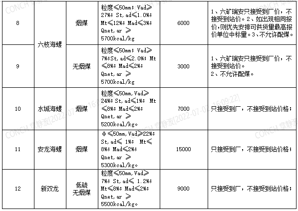 6.2022年7月21日至2022年8月20日合同期內(nèi),若中標(biāo)單位在2022年8月6日24時(shí)前供貨量(銷發(fā)系統(tǒng)進(jìn)廠數(shù)量)小于合同約定量的30%的中標(biāo)單位,不予以參與海螺水泥貴州區(qū)域2022年8月21日至2022年9月20日煤炭招標(biāo)(僅買方原因或不可抗力因素除外,鐵路在途和在站煤炭不給予納入供貨量,僅以進(jìn)廠數(shù)量為準(zhǔn)),并取消在貴州區(qū)域所有海螺6個(gè)月內(nèi)的投標(biāo)資格。