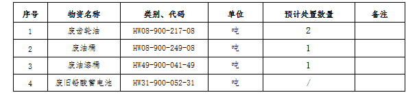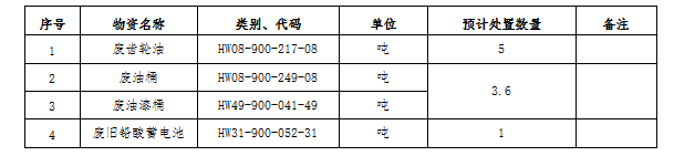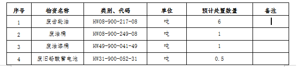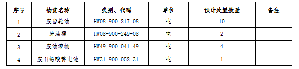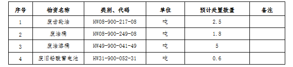 (一)標(biāo)的內(nèi)容及處置數(shù)量:廢礦物油、廢油桶、廢油漆桶、廢鉛酸蓄電池等危廢材料。處置數(shù)量以區(qū)域內(nèi)5家公司(南通海螺、海門海螺、太倉海螺、海螺明珠、張家港海螺)實(shí)際過磅為準(zhǔn)。