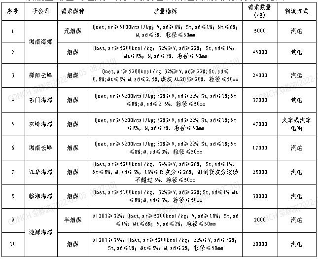 根據(jù)2022年9月21日-2022年10月20日海螺水泥湖南區(qū)域各子公司煤炭需求,現(xiàn)擬對煤炭進行公開招標,選定中標人,為體現(xiàn)公平、公正、公開的原則,拓寬采購渠道,現(xiàn)將招標相關(guān)事宜公告如下: