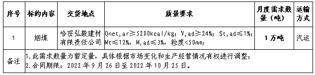 根據(jù)2022年10月份哈密弘毅建材公司煤炭需求,現(xiàn)擬對(duì)煤炭進(jìn)行招標(biāo),選定中標(biāo)人,本著公平、公正、公開(kāi)的原則,拓寬采購(gòu)渠道,現(xiàn)將招標(biāo)相關(guān)事宜公告如下: