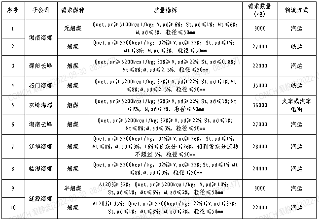 根據(jù)2022年10月21日-2022年11月20日海螺水泥湖南區(qū)域各子公司煤炭需求,現(xiàn)擬對煤炭進行公開招標,選定中標人,為體現(xiàn)公平、公正、公開的原則,拓寬采購渠道,現(xiàn)將招標相關(guān)事宜公告如下: